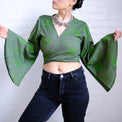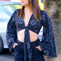 Discover the Celestial Bell Sleeve Tie Top for versatile, timeless styling. Feel confident in this handmade top crafted with organic cotton, featuring a celestial print for a bohemian, retro look. Accent your festival fashion with this hippie crop top, designed for plus-size inclusivity and inspired by 90s style