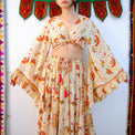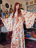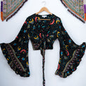 Embrace your inner free spirit with our Celestial Flare Sleeve Wrap Top. With its bohemian tie top design and retro flare sleeve, this 70s inspired piece is perfect for a boho or y2k look. Plus, its celestial and floral prints add a touch of vintage vibes to your wardrobe. Perfect for summer festivals or everyday wear, this top comes in plus sizes to be inclusive for all.