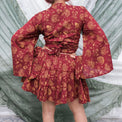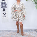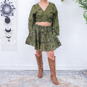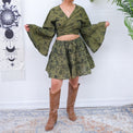 Add ethereal vibes to your summer wardrobe with our Flowy Tiered Mushroom/Celestial Skirt Set. The elastic waist ensures a comfortable fit while the skorts style provides versatility. Embrace the boho hippie style with the flowy, short tiered skirt adorned with whimsical mushroom and celestial prints. Perfect for a stylish and effortless summer look. With an inner lining designed like shorts, you can move freely and comfortably in this two piece set.