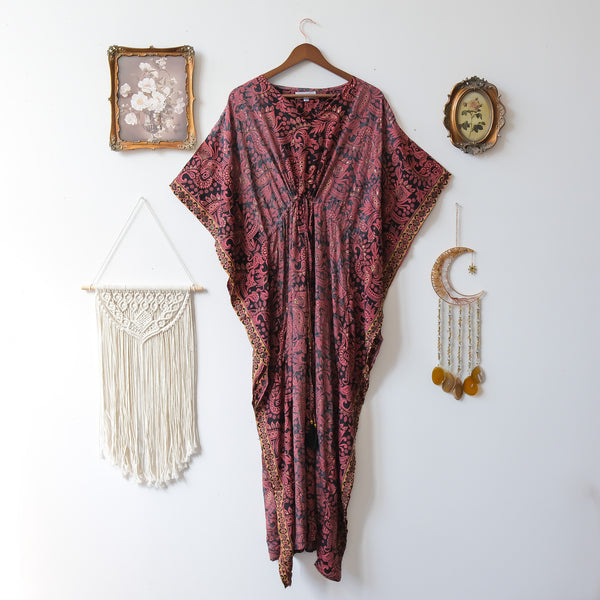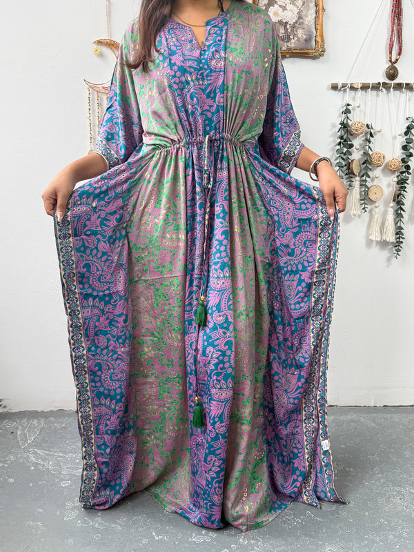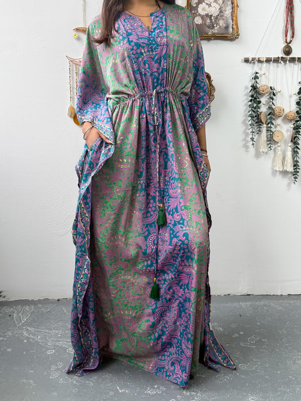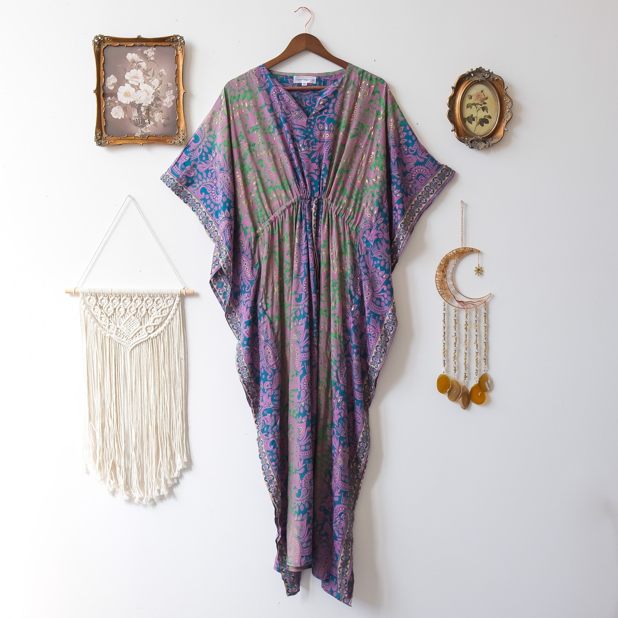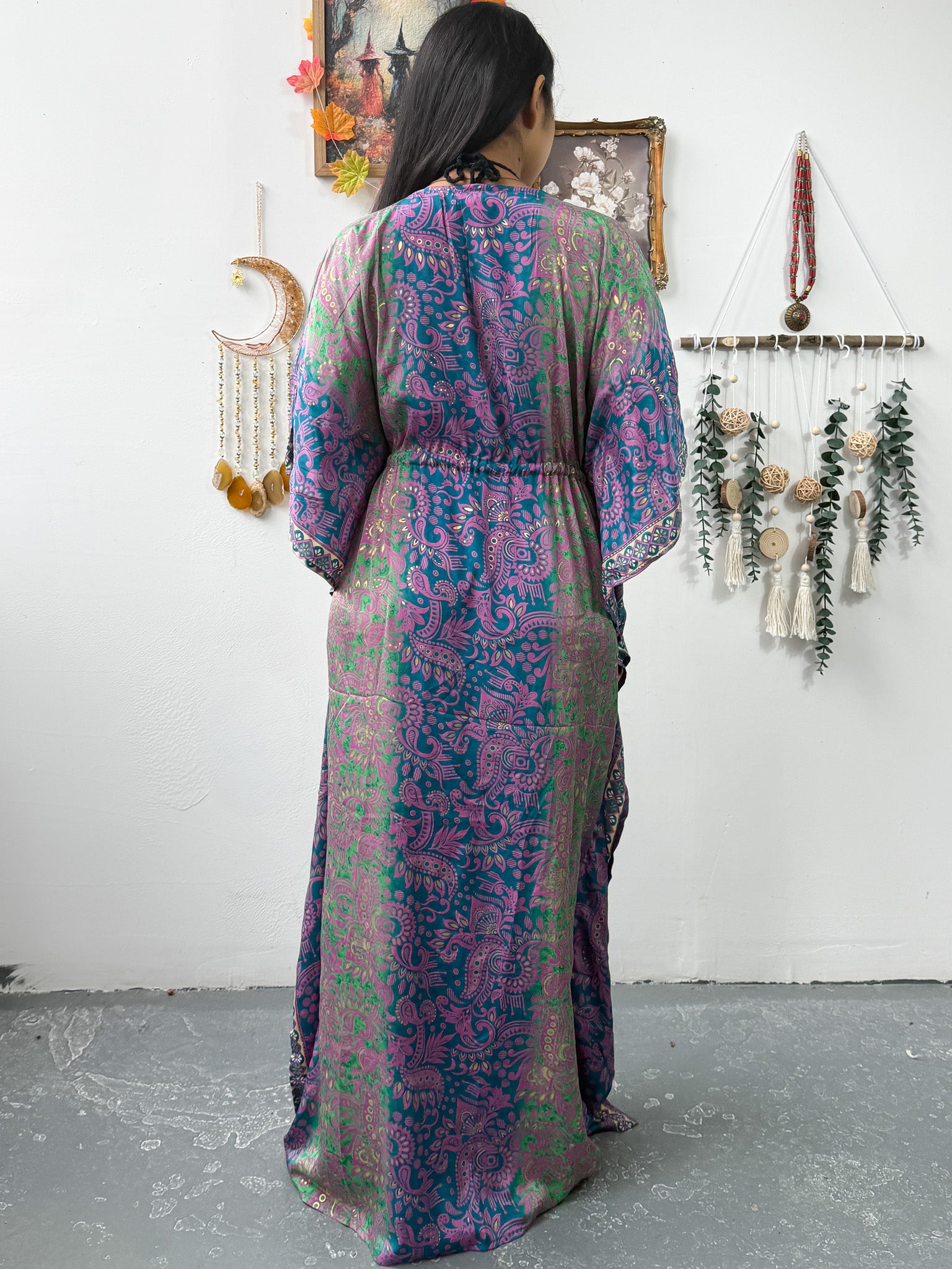 Wear this kaftan for festivals, travel, or resort wear. Its versatile design allows you to pair it with different outfits. The recycled silk material ensures durability and comfort. Stay stylish and eco-friendly with this boho festival kaftan.