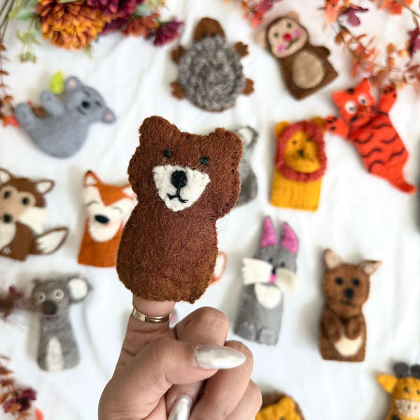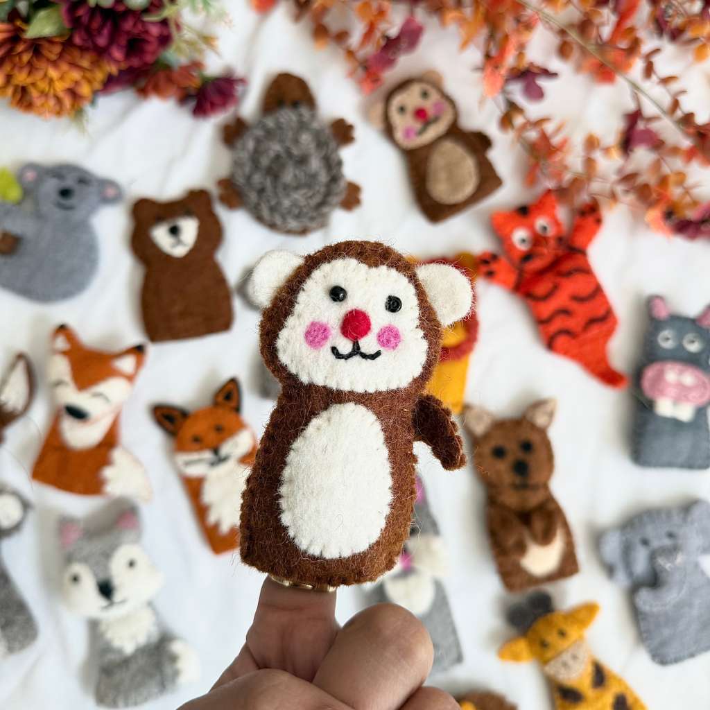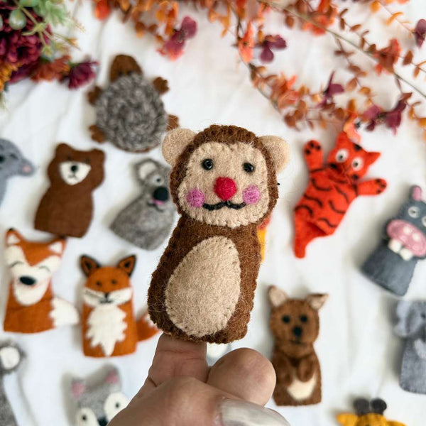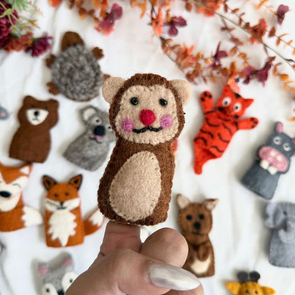 Keywords: handmade felt finger puppets, woodland animals, eco-friendly toys, educational play, badger puppet, bee puppet, wolf puppet, dog puppet, Montessori toys, handmade gifts.