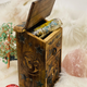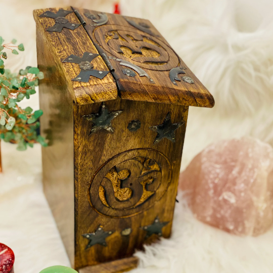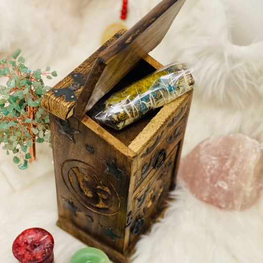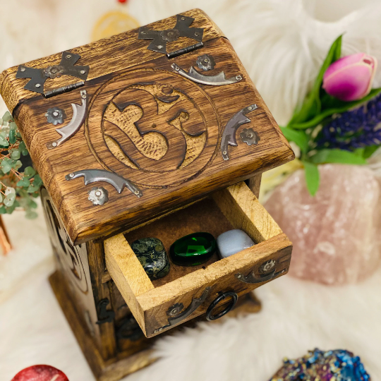 Crafted by hand, this traditional wooden cabinet features beautiful detailing and five distinct storage boxes, ideal for storing jewels, crystals, and personal trinkets. Each compartment is uniquely designed, with a wooden om cupboard, wood alter box, stash box, crystals divination box, and tarot box, all of which are made from durable, vintage materials.