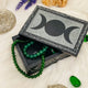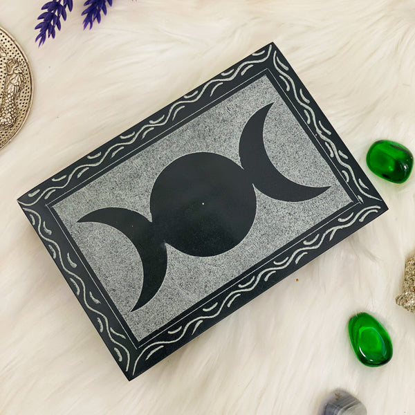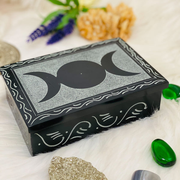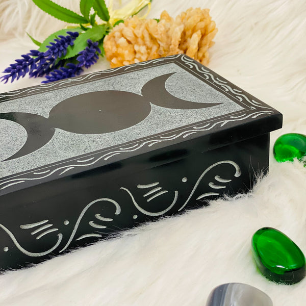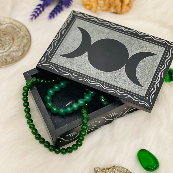 Triple Moon Soapstone Box is a handcrafted jewelry box made of wood with an engraved detailed moon that can also store herbs and other items. With its charm and reliable protection, it is an ideal choice for securely storing small items. Its wooden composition provides lasting durability and its intricate design adds a touch of sophistication.