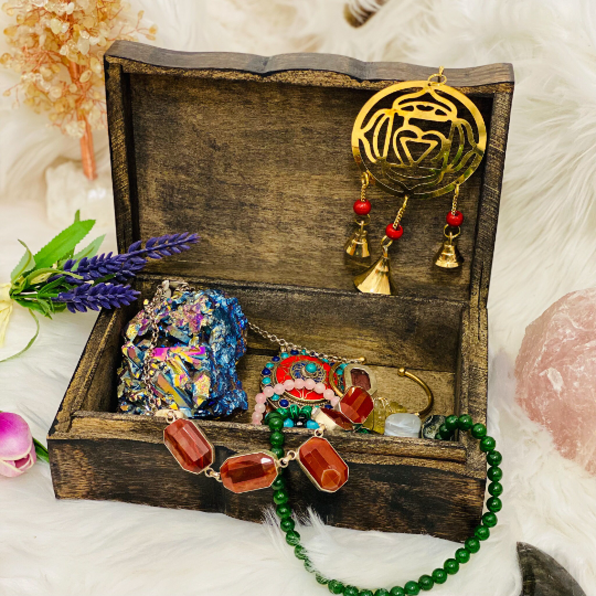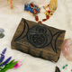 Triple Moon Wooden Box is a handcrafted jewelry box made of wood with an engraved detailed moon that can also store herbs and other items. With its rustic charm and reliable protection, it is an ideal choice for securely storing small items. Its wooden composition provides lasting durability and its intricate design adds a touch of sophistication.