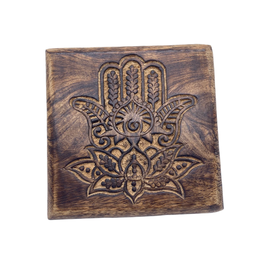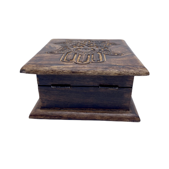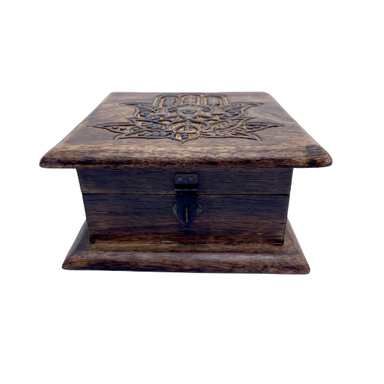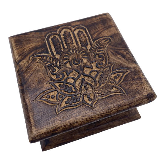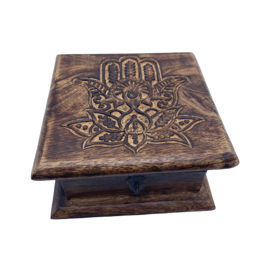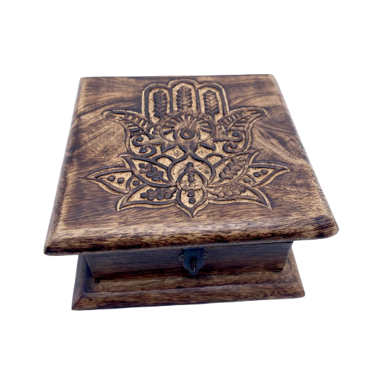 This unique handmade box has been carved with Lotus Hamsa Hand Design which makes it a unique and lovely gift .
