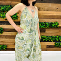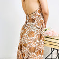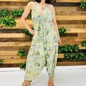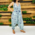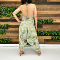 Exude summer vibes with this upcycled fashion backless jumpsuit. Crafted with a chic harem style, its boho look is perfect for beach and festival wear. Made with comfort and style in mind, this jumpsuit will be a stunning addition to your summer wardrobe.