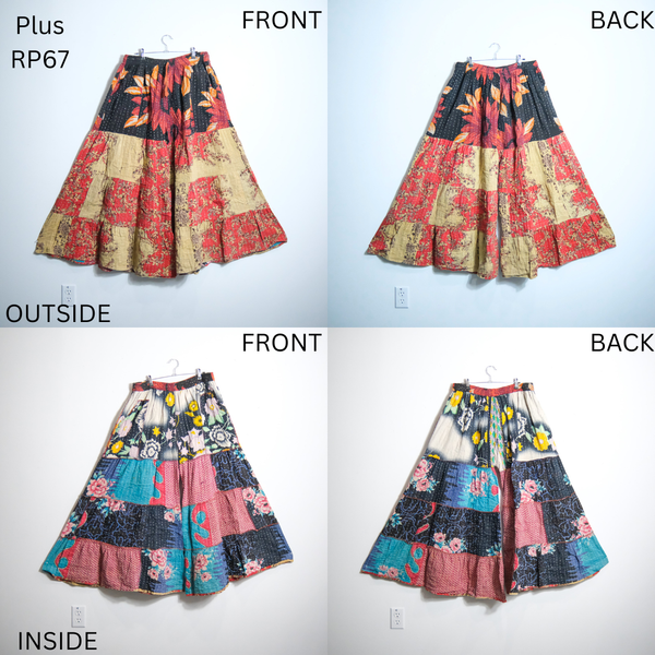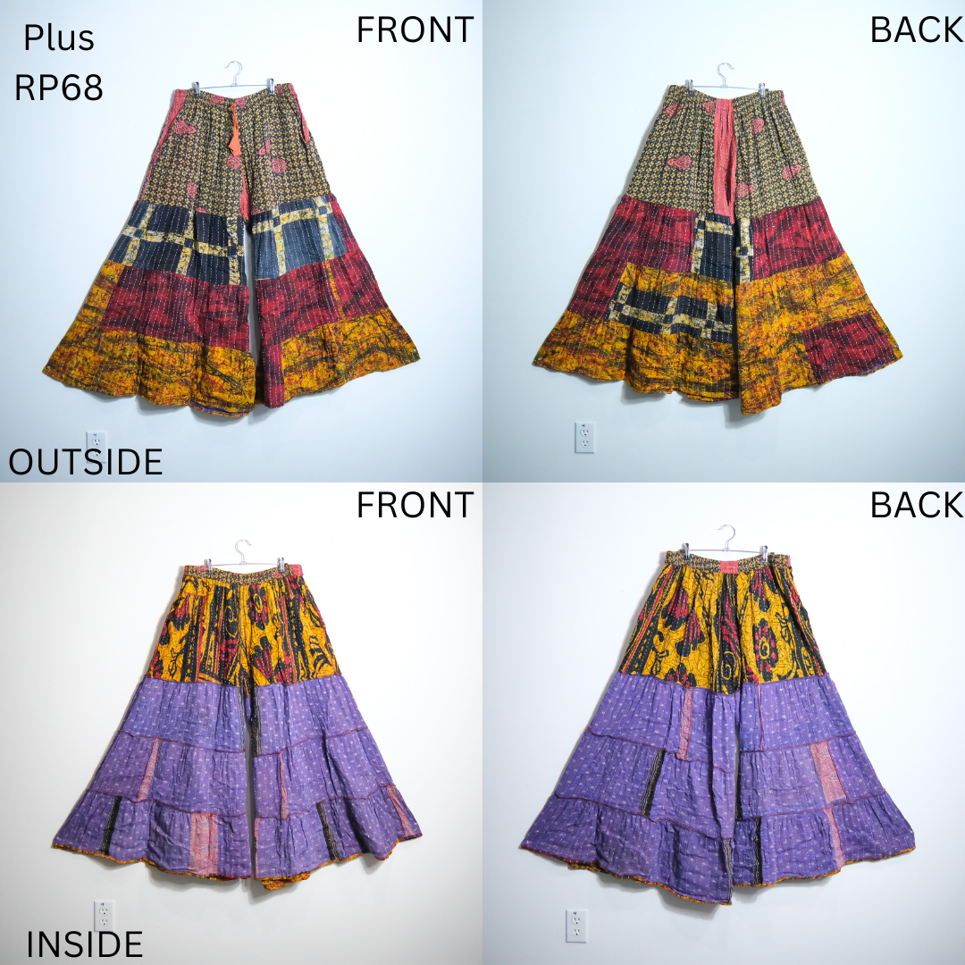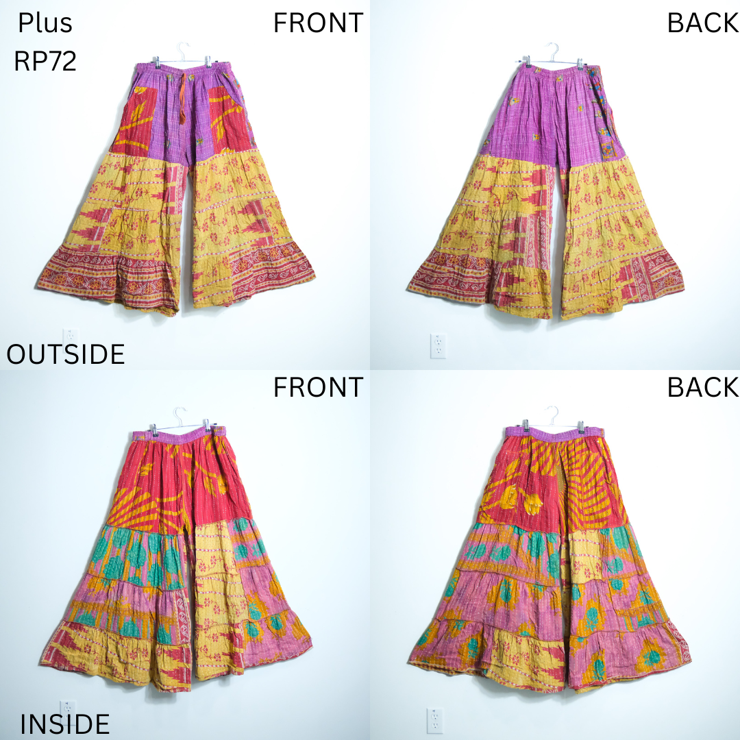 Discover the perfect blend of style and sustainability with our Kantha Plus Size Boho Reversible Pants. Handmade and one-of-a-kind, these flowy tiered pants feature a boho hippie style and are inclusive of all sizes. Keep your essentials close with pockets and feel good knowing your fashion is vintage and sustainably crafted.