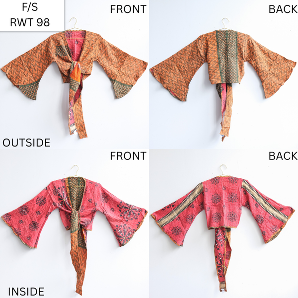 These tops can be worn in many ways. They can be worn open like a kimono, tied in a knot at the back or the front, or wrapped around the waist