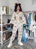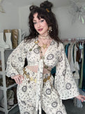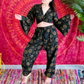 This Celestial Pant Set with Bell Sleeve Top features handmade bamboo cotton fabric with celestial sun and moon prints in a unisex, boho-hippie style. Perfect for festival fashion, the two-piece pant set includes a bell sleeve top. Wear this set for your favorite yoga poses or more casual activities.