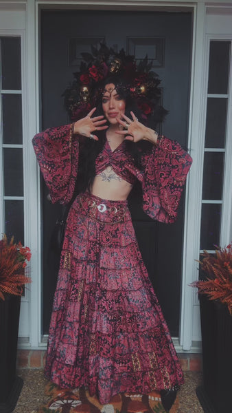 This plus size-inclusive outfit exudes ethereal goddess vibes with its handmade flowy tiered skirt and ruffle sleeve top. The intricate paisley print adds to the boho vibes, making it a must-have for those with a fairy core aesthetic.