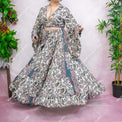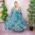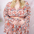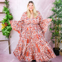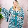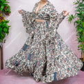 Experience the whimsical charm of Fae Haven with this handmade floral tiered skirt and ruffle sleeve top set. Adorned with gold details, this sustainable and plus size inclusive outfit can be styled as a wrap top, tie top, or kimono. Perfect for a fairycore, cottagecore, or festival fashion look.