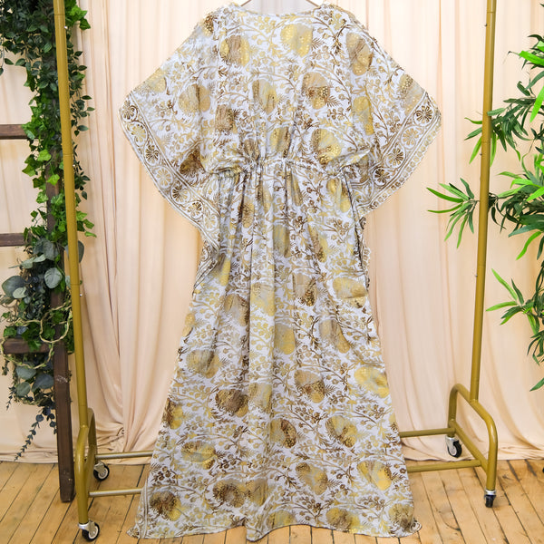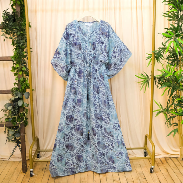 Elevate your wardrobe with this Boho Festival Kaftan. Crafted from recycled silk, it's an eco-friendly travel dress perfect for lounging or resort wear. This long kimono-style kaftan offers versatility and comfort. Ideal for festivals or casual outings, it combines style with sustainability. Embrace the bohemian vibe with this unique piece.