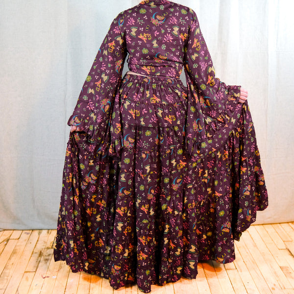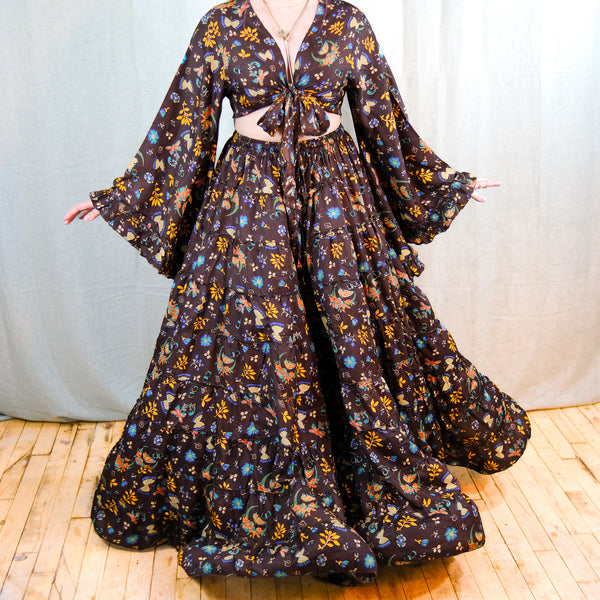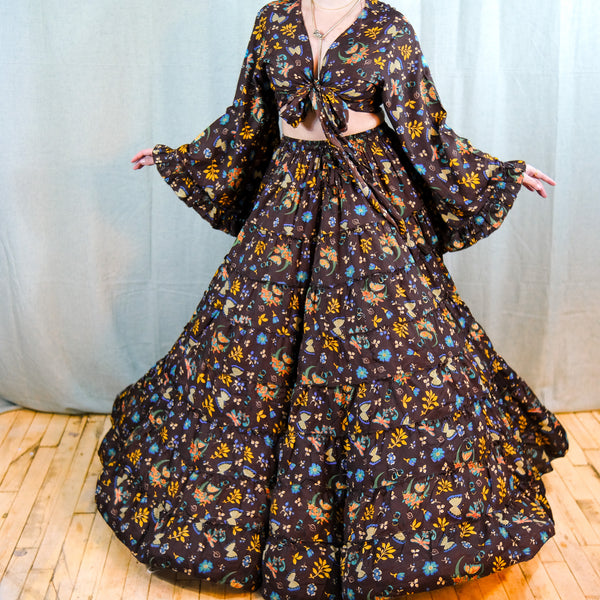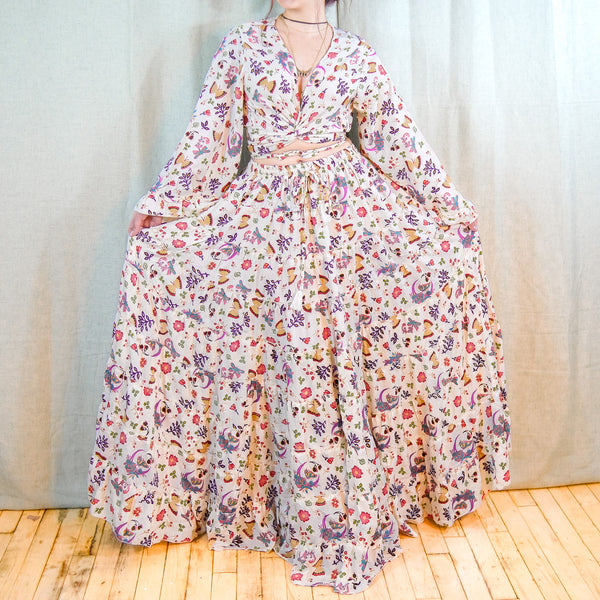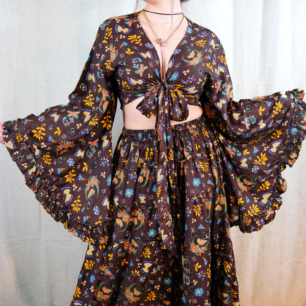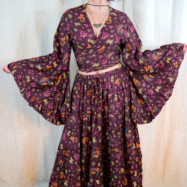 Elevate your wardrobe with our Forest Whisper Skirt and Ruffle Sleeve Top. Boasting a whimsical witchy vibe, this set features a celestial butterfly floral print and a flowy tiered skirt, perfect for twirling. The dreamy fairy vibe and 90s nostalgia make it a must-have for a magical summer. Plus, it's inclusive for all sizes.