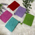 It's wool felt, but it's sturdy and lightweight. It keeps your small day-to-day items in place. You can put your metro card, money, or other business cards. It is plain on the reverse, has a good zip, and is lined inside. These purses are washable and wear-resistant. Each purse comes with a zip closure, topped with a matching ball of felt