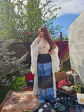 Explore your whimsical side with our Midnight Flutter Boho Skirts. Made by skilled artisans, these flowy tiered skirts feature functional pockets and an elastic waist for both comfort and style. The block print, inspired by whimsygoth fashion, adds a touch of grunge to the boho hippie style. Perfect for tall girls, this cotton skirt has a denim look without the weight.