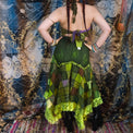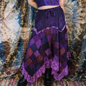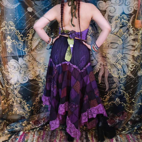 This handmade patchwork asymmetrical lace skirt features delicate hand embroidery and layered ruffles, creating a unique, one-of-a-kind piece. Its earthy tones and whimsical design evoke fairy and witchy vibes, perfect for those seeking a pixie-inspired look. Lightweight and versatile, it suits summer wear and transitions effortlessly through all seasons. Embrace an enchanting style with this artisanal skirt that blends craftsmanship and ethereal charm.