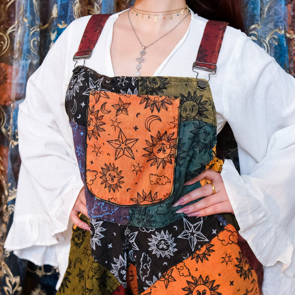 ✨ Handcrafted Elegance ✨Embrace the whimsical charm of our handmade hippie overalls. This romper features a patchwork design inspired by celestial motifs, perfect for festival clothing. It's a unique piece that combines boho and fairycore styles. Ideal for those who love cottage core outfits, it offers a playful yet elegant look.