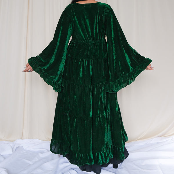 Wrap yourself in magic with our Bohemian Velvet Goddess Maxi Duster – a flowing statement piece designed for dreamers, wanderers, and old souls. Crafted from luxuriously soft velvet, this robe features dramatic bell sleeves, a tiered skirt, and a floor-sweeping silhouette that moves gracefully with every step. Its open front with tie closure makes it perfect for layering, whether over a simple outfit, festival attire, or an elegant gown.