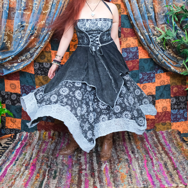 Unleash your inner forest witch or celestial fairy with this spellbinding Witchy Celestial Cotton Pixie Dress, where fae magic meets dark romance. Handcrafted with breathable, natural cotton, this enchanting maxi dress features an asymmetrical handkerchief hemline layered with celestial star and moon prints, corset-style lace-up bodice, and delicate lace trim for that perfect ethereal touch.