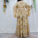 This fashionable 70s-style pant set is sure to make an impact. Constructed with recycled silk, this set is incredibly comfortable and perfect for any occasion. The classic bell sleeve tie top and wide-leg trousers create a retro yet timeless look. Enjoy sustainable fashion with this chic 70s silk pant set.