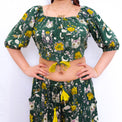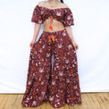 Embrace your whimsical side with this handmade Boho Cat & Moon Two-Piece Set, designed for plus-size inclusivity. Featuring a flowy tiered pant with convenient pockets and a versatile ruffle sleeve top, this set showcases a celestial print of moons, cats, bats, and flowers in earthy tones. The top offers multiple styling options—wear it off-shoulder, as a regular top, or adjust the drawstring ruching at the center for a custom fit. Puffy sleeves add a romantic touch, making this set perfect for those who love boho, witchy, and free-spirited fashion.