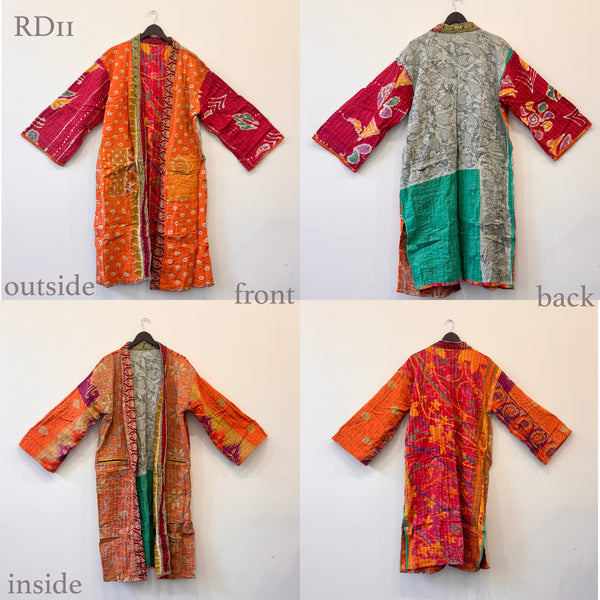 Wrap yourself in artistry and warmth this season with our Kantha Reversible Duster — a one-of-a-kind handmade jacket crafted from upcycled vintage cotton saris. Each piece is hand-stitched with traditional Kantha embroidery, giving it a soulful texture and timeless charm.