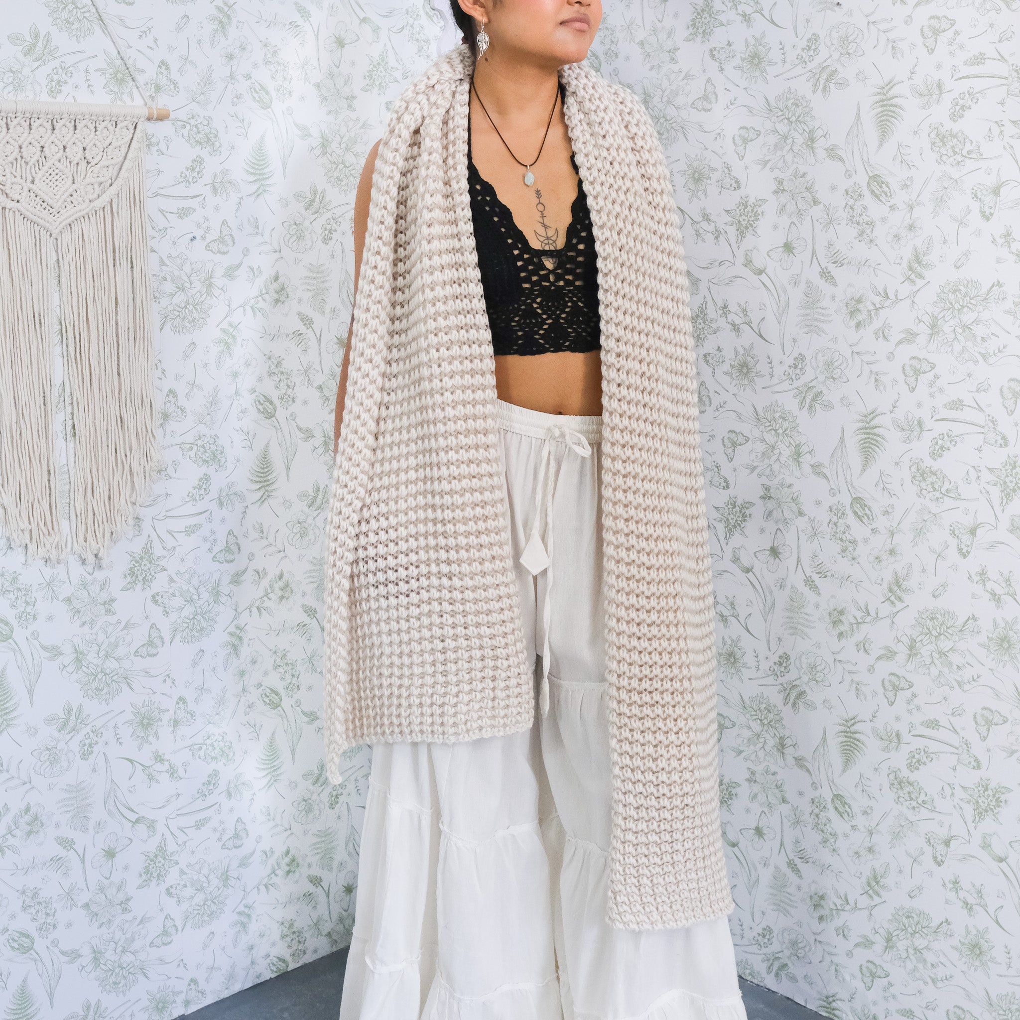 Our hand knitted long wool blend scarves are the perfect winter essential. The soft cashmere feel and neutral colors make them unisex yet stylish, ideal for a classic boho look. The blend of wool and cashmere ensure these scarves keep you warm, cozy, and comfortable all winter long.
