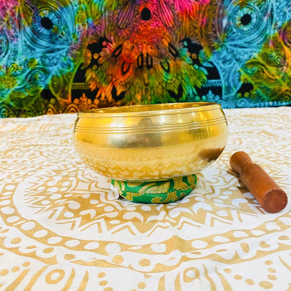 The 5 inches hand beaten singing bowl comes with a wooden striker and hand sewn cushion which will be different than in the picture.