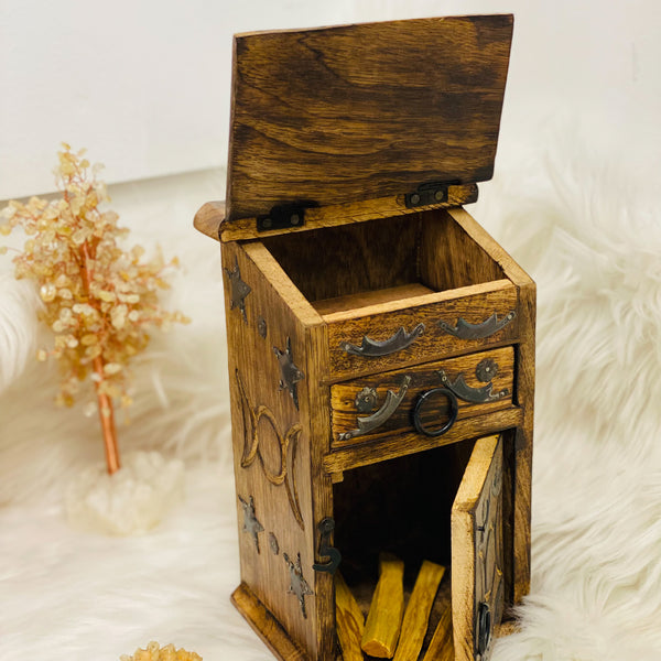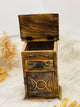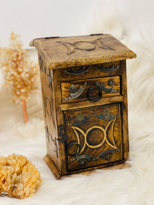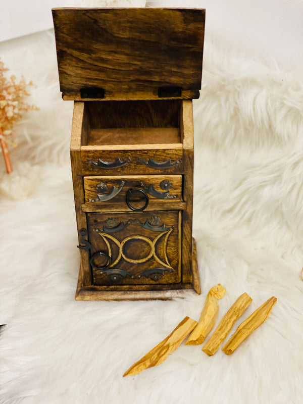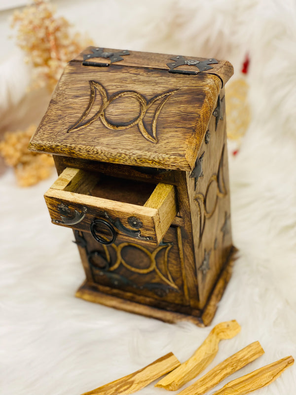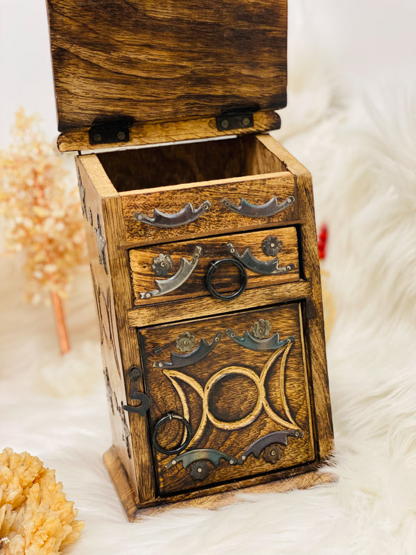 This one-of-a-kind wooden box features a triple moon design and is handmade with quality craftsmanship. Perfect for storage of crystals and jewelry, it is embellished with Celtic and witchy styles. The almirah Celtic box is ideal for those looking for a unique and beautiful way to store their precious items.