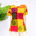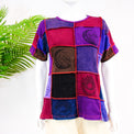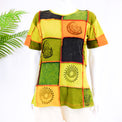 This Patchwork Short T-Shirt offers modern fashion with a touch of retro. It features a patchwork top with vintage boho and cozy cotton material, perfect for festival wear. The t-shirt is available in sizes and features a unique mushroom print for a stylish grunge look.