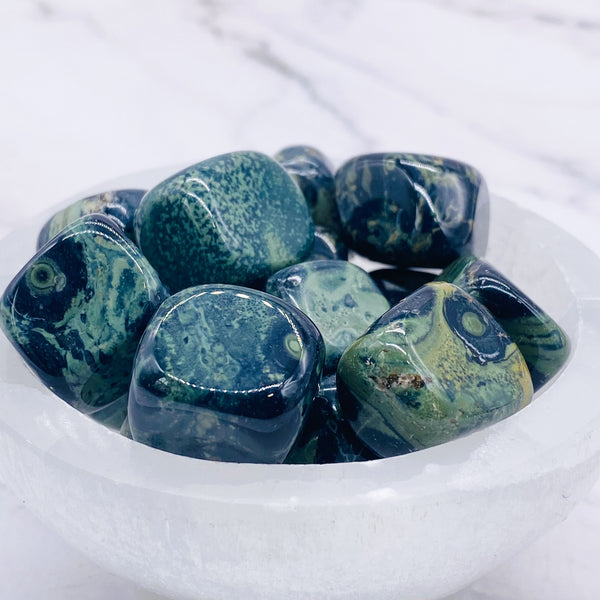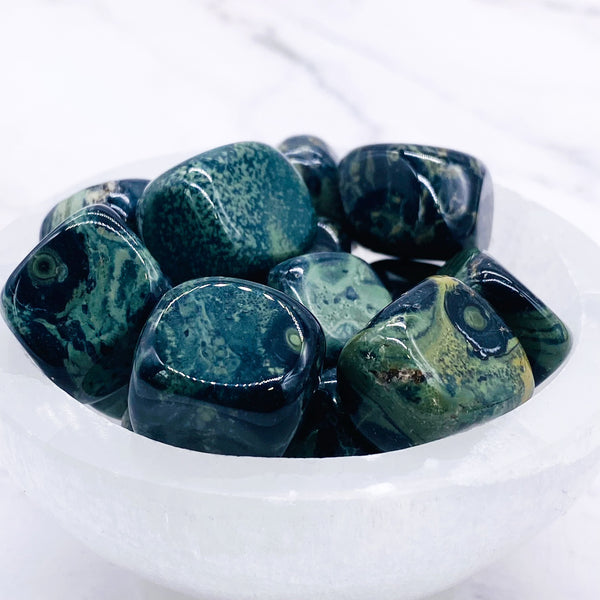 Kambaba Jasper is a stone of peace, tranquility, and fertility. It reminds us of the gift of life and our connection to all living things of the present, past & future. Rich in orbs and swirls of green and black, this stone is commonly used to aid in meditation. Known for providing peace and tranquility, Kambaba Jasper is said to remove blockages in the heart and base chakras to dispel worry and negativity, and allow a clear path for clarity and serenity to flow.