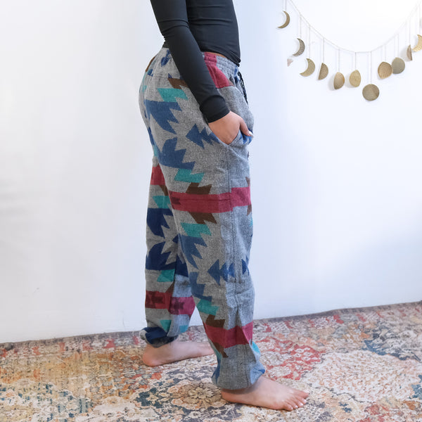 Made with a wool-cashmere blend, these handmade plaid print unisex joggers are perfect for winter. They're warm, comfortable, and stretchy, making them ideal for yoga and everyday wear. Built for both comfort and style, these joggers are non-itchy and provide a boho-hippie look.