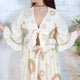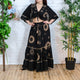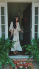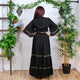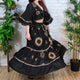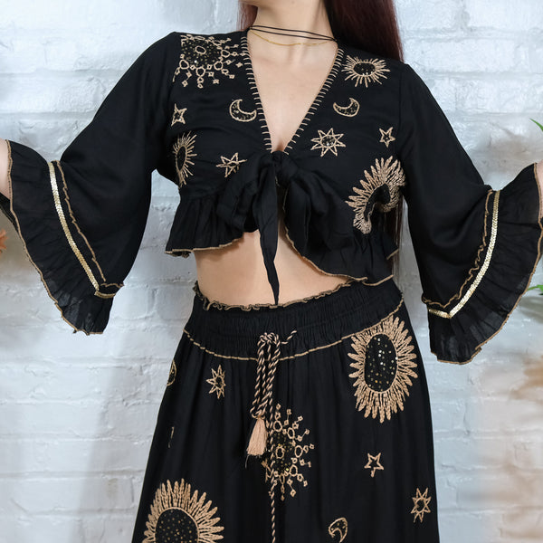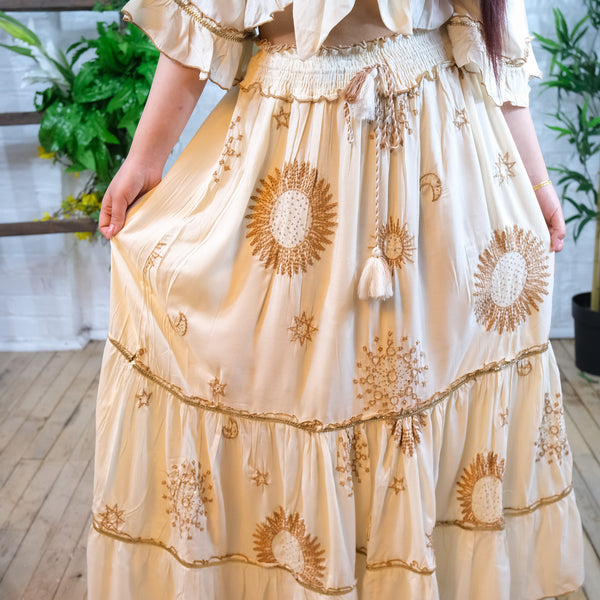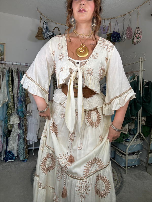 The Bohemian Embroidery Skirt with Ruffle Sleeve Top is a handmade, flowy tiered skirt that exudes bohemian style. The celestial embroidery adds a whimsical touch. The elastic waist with drawstring allows for adjustable comfort. Experience retro boho 90s fashion with this summer maxi skirt.