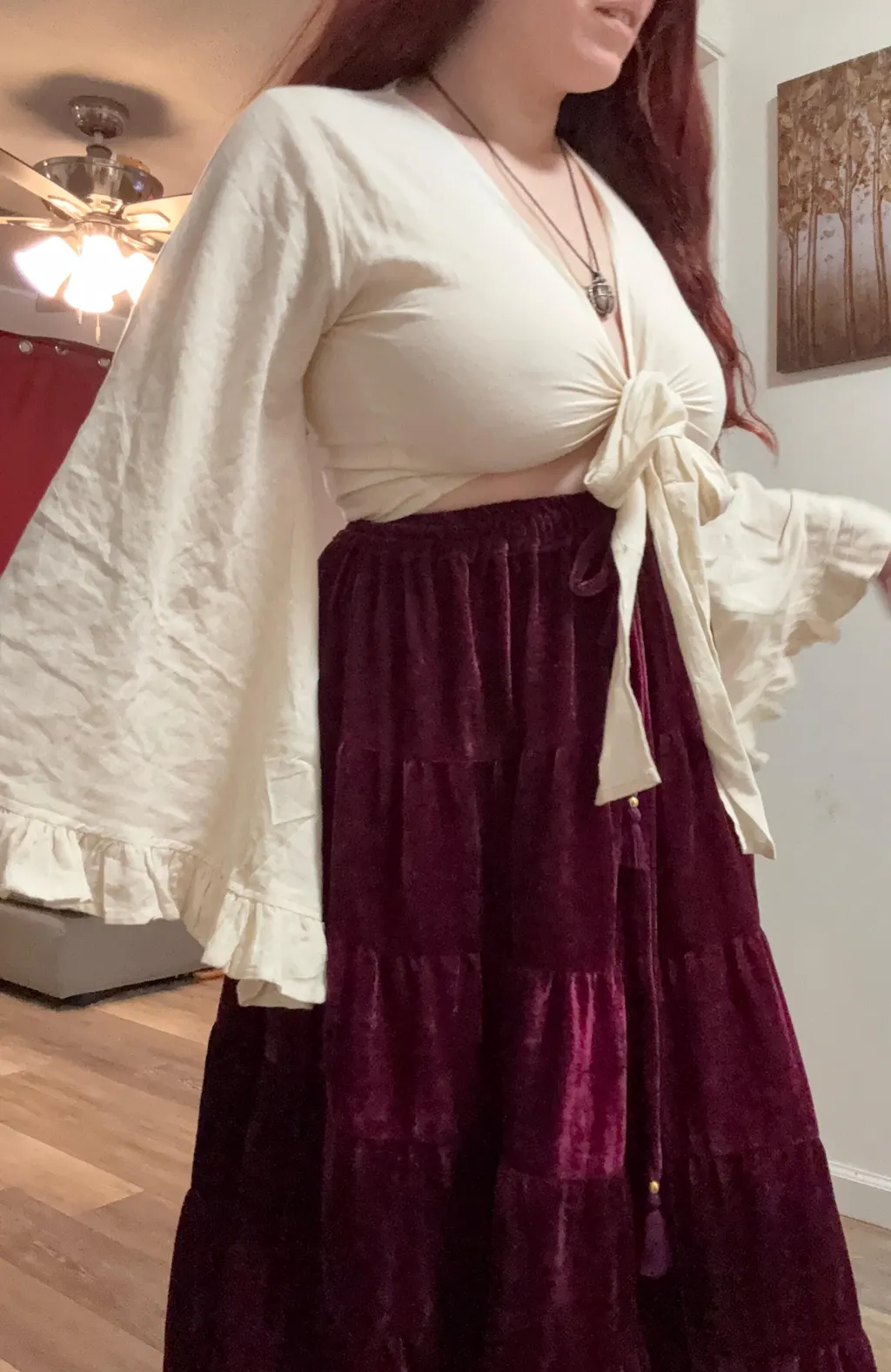Step into effortless elegance with this flowy tiered velvet skirt and ruffle sleeve wrap top set, designed for dreamers, wanderers, and free spirits. Crafted from soft, lightweight velvet, this two-piece outfit moves beautifully with every step, creating a romantic and ethereal silhouette.