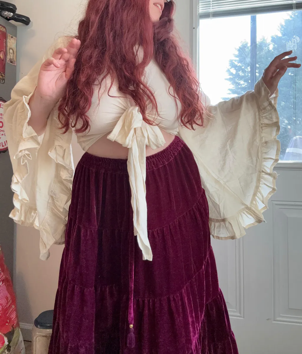The long tiered maxi skirt features a comfortable, adjustable waist and dramatic flow, making it perfect for dancing, festivals, or everyday statement styling. The wrap top with ruffle sleeves adds a whimsical touch, allowing you to adjust the fit to your body and style it in multiple ways.