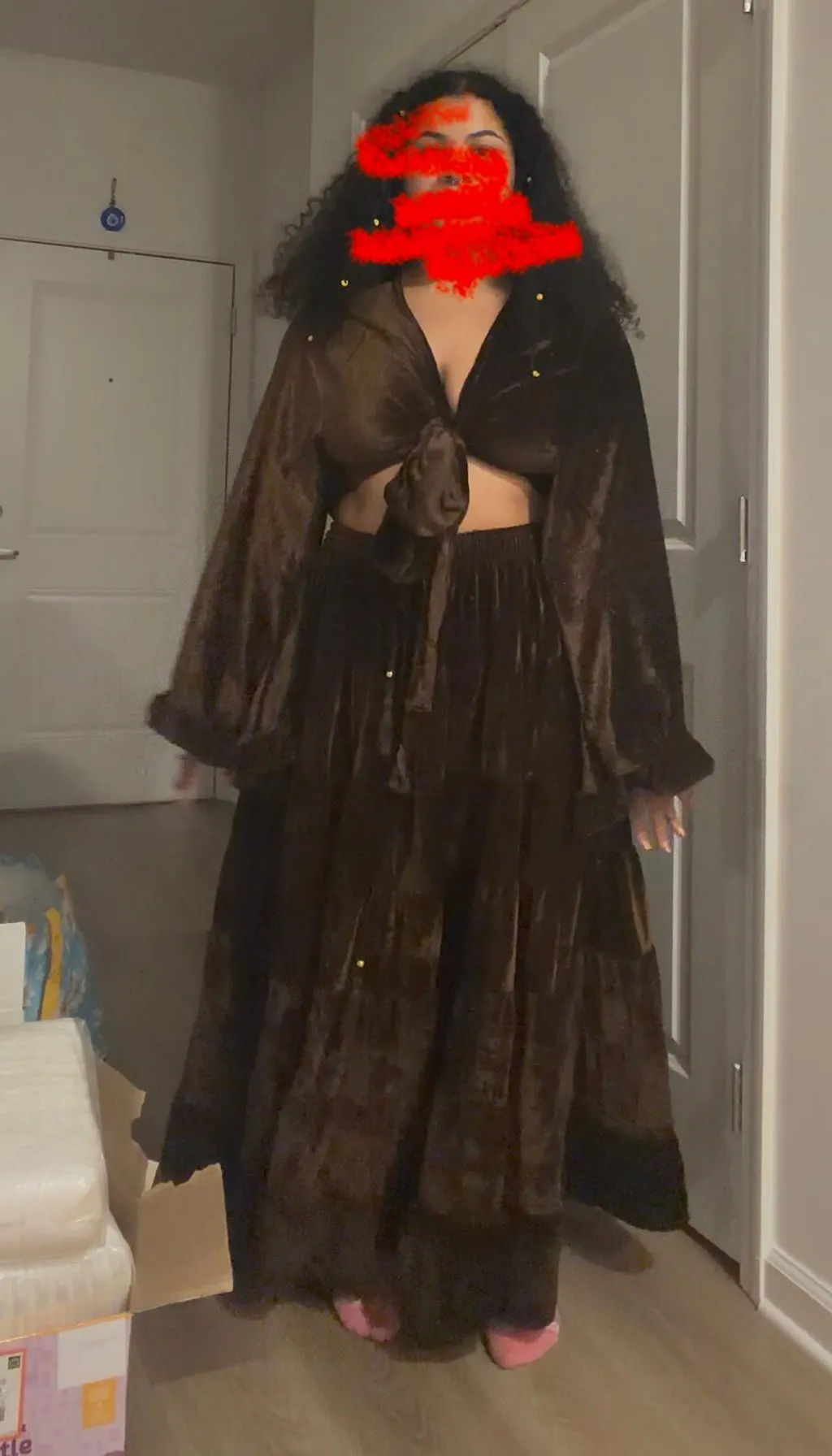 Two-piece set: tiered velvet maxi skirt + wrap top