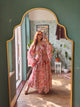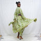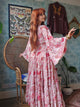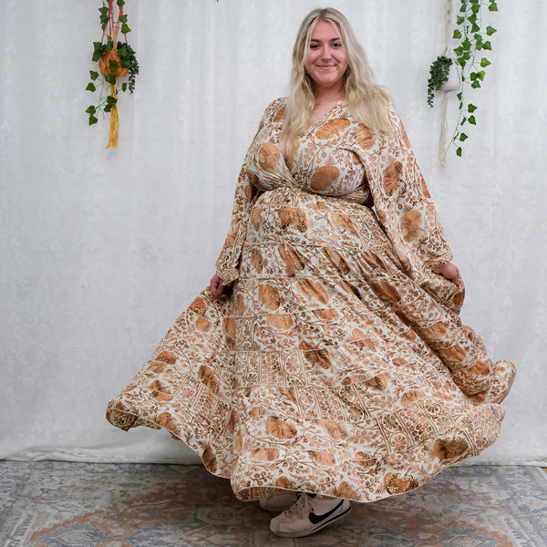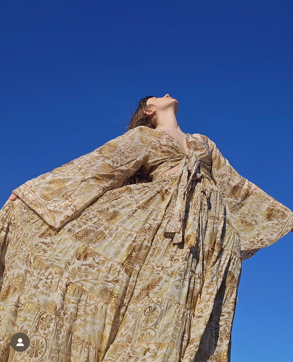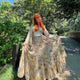 This Bohemian Vintage Style Long Ruffle Skirt is crafted from luxurious recycled silk, making it a sustainable and elegant choice. The skirt is finished with a floral print and a flattering ruffled design. Perfect for creating a hippie maxi look with a retro touch.