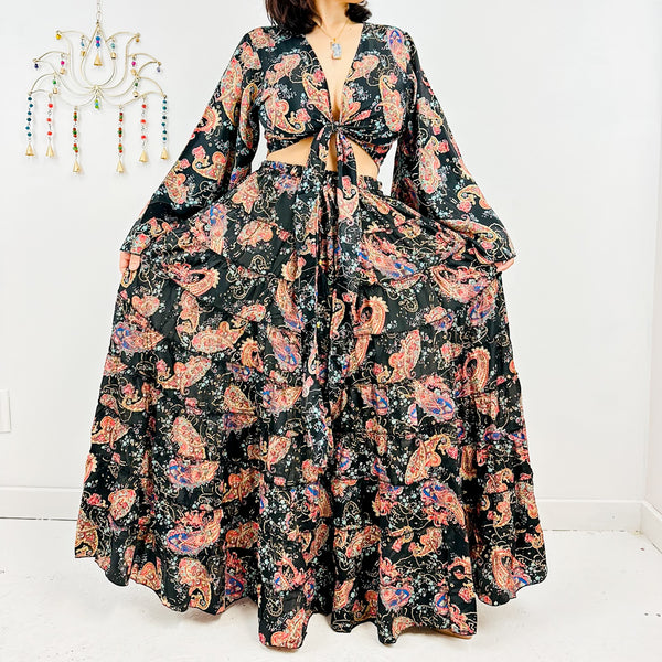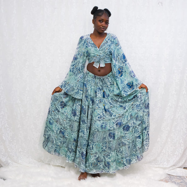 Bohemian Vintage Style Long Ruffle Skirt and Tie Top Set