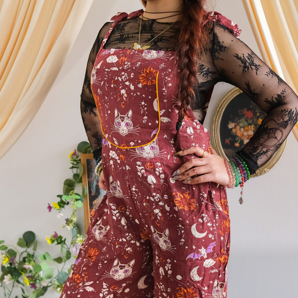 🌙 Celestial Cat & Moon Wide-Leg Jumpsuit | Boho Witchy Overalls