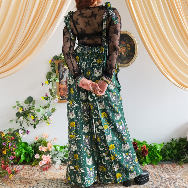 Step into witchy boho magic with our Celestial Cat & Moon Jumpsuit — the perfect blend of comfort, style, and mystical vibes. Featuring enchanting cat prints, moons, stars, and florals, this handmade piece is designed for free-spirited souls who love to stand out.