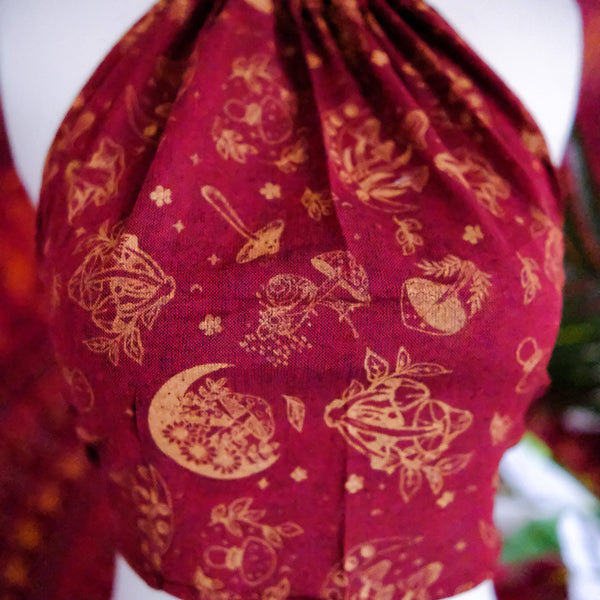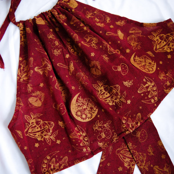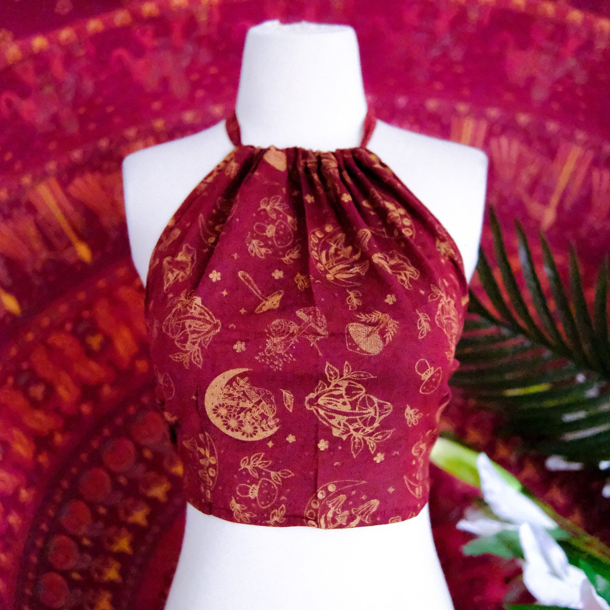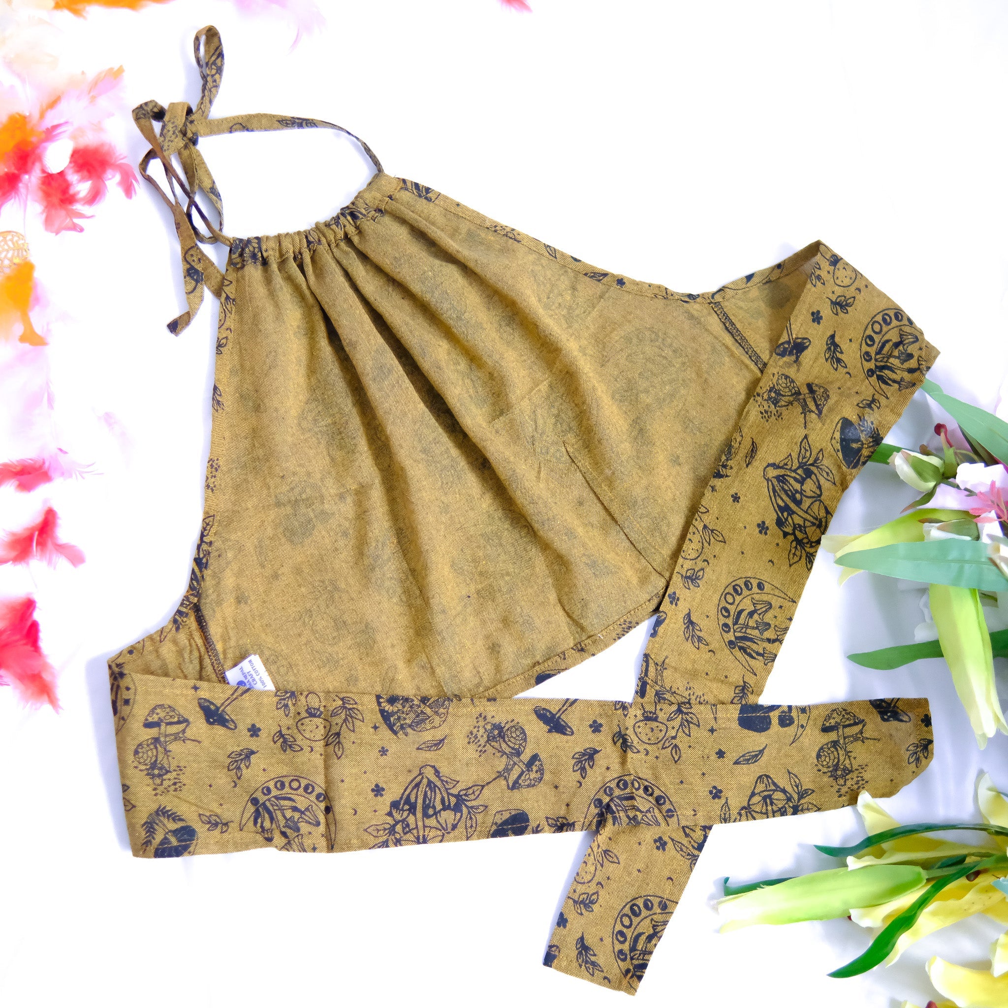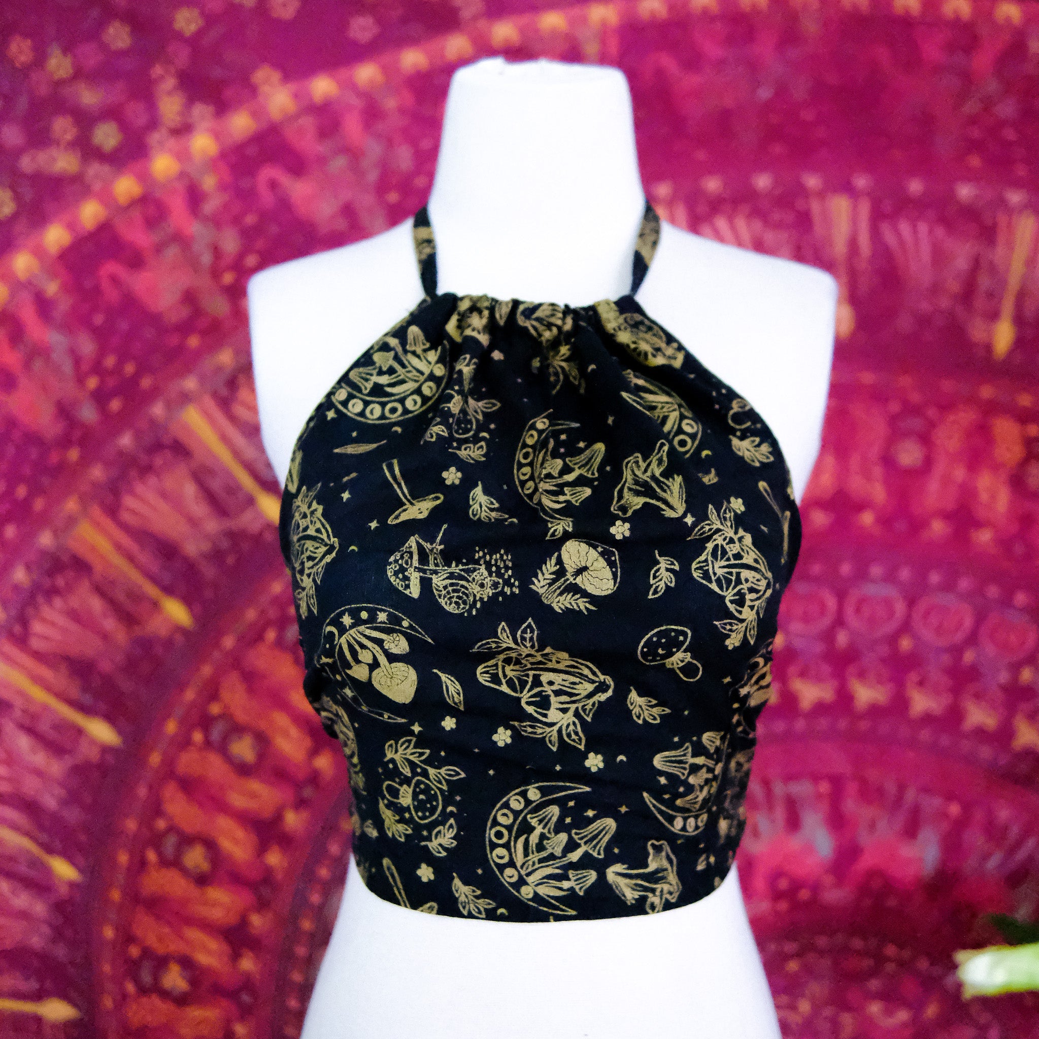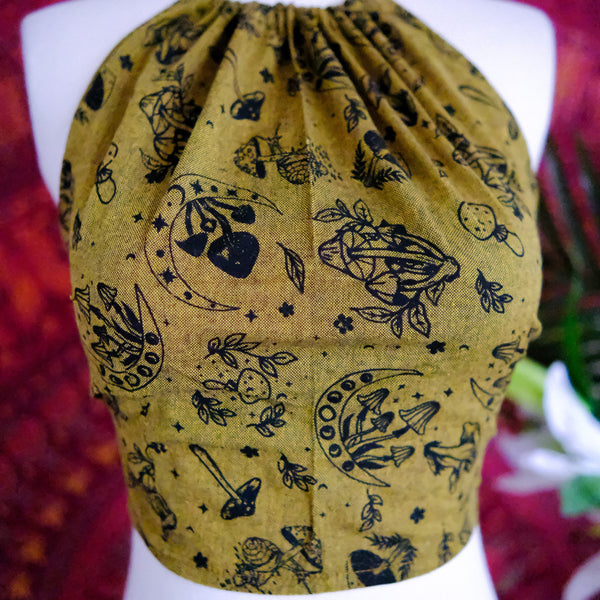 This Mushroom/Celestial Halter Top is a handmade cotton crop top perfect for summer. With a unique mushroom, sun and moon print, this top brings a boho, hippie and whimsical vibe to your wardrobe. Plus, it's backless and tie-up design makes it perfect for any body type. The earth tone and vibrant colors add a touch of 70s and 90s flair, making it great for beach days or festivals.