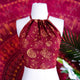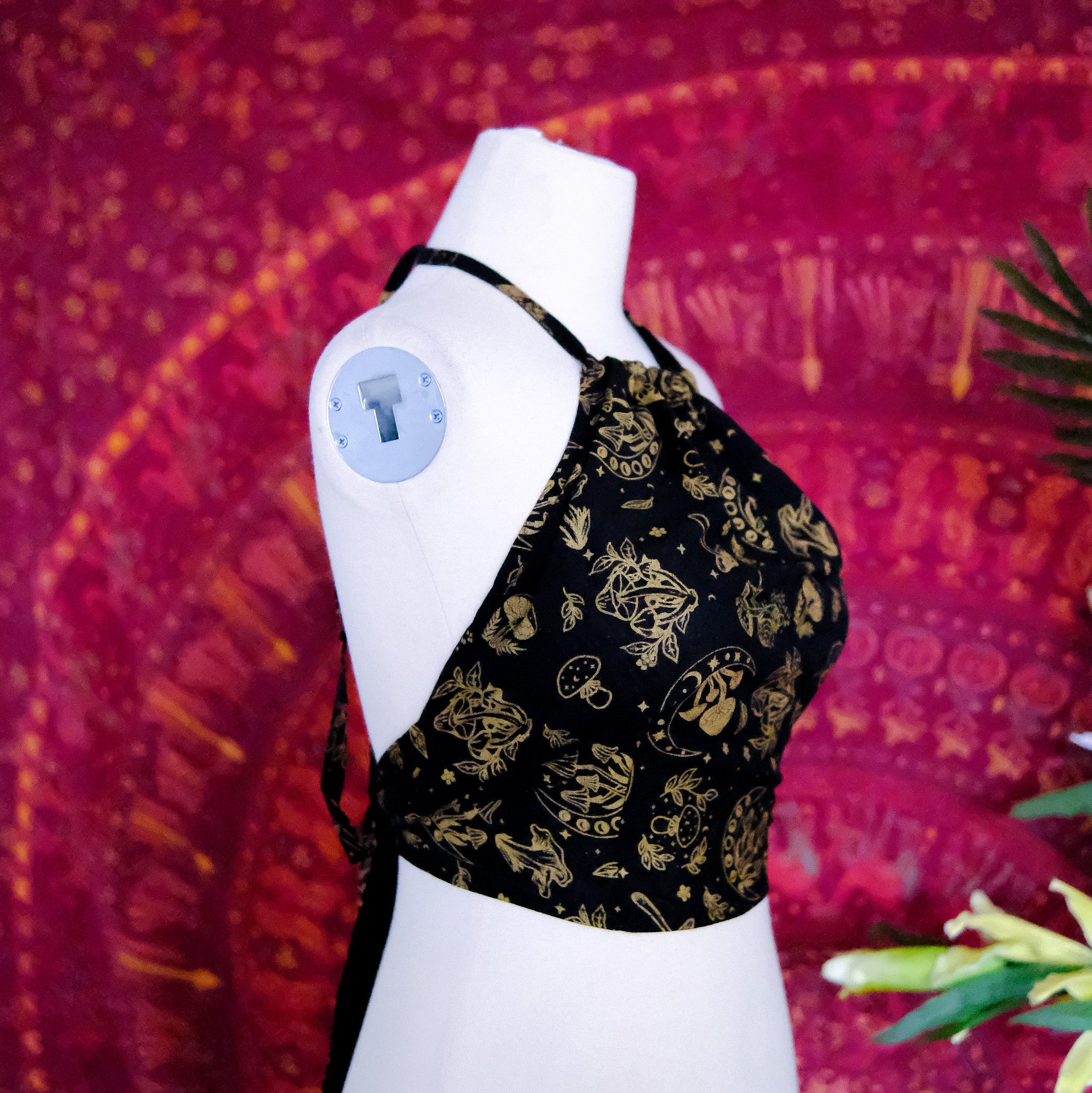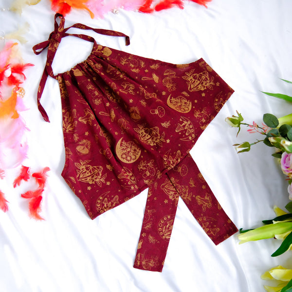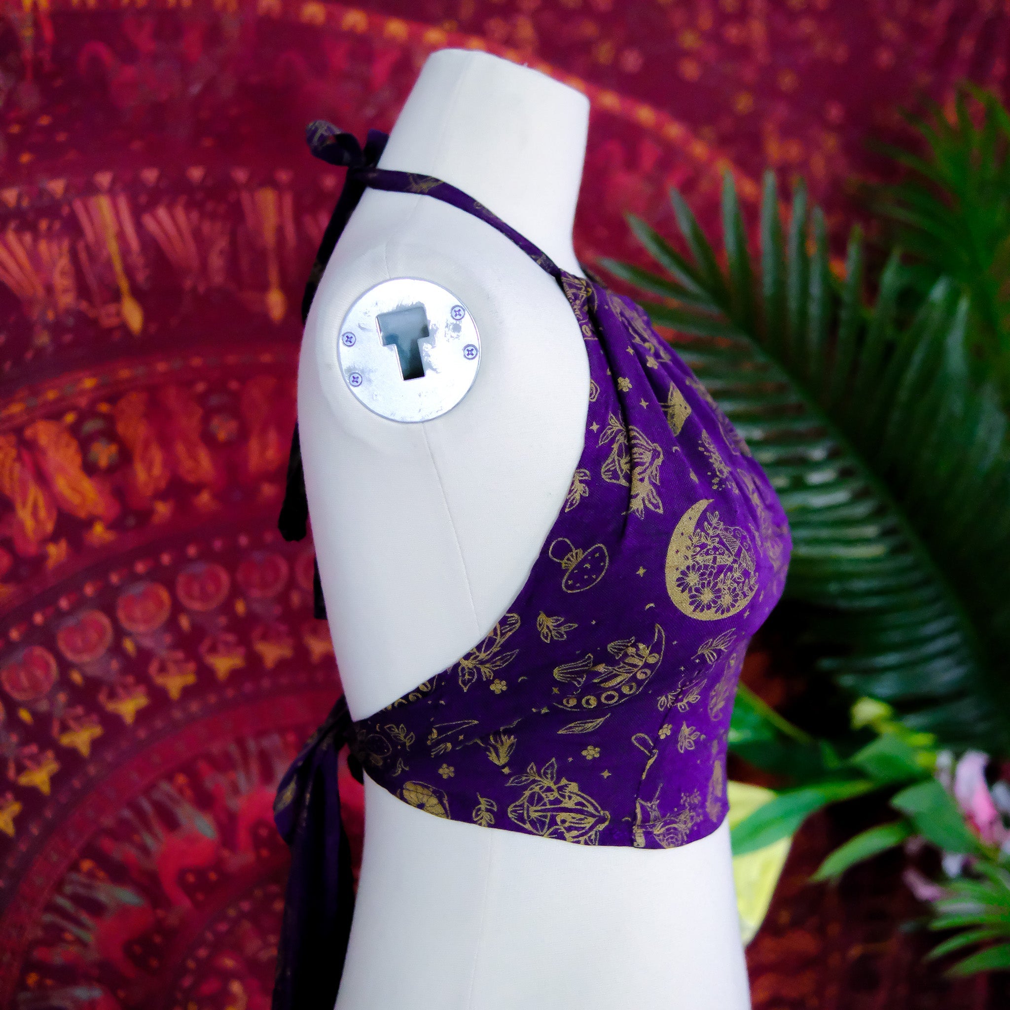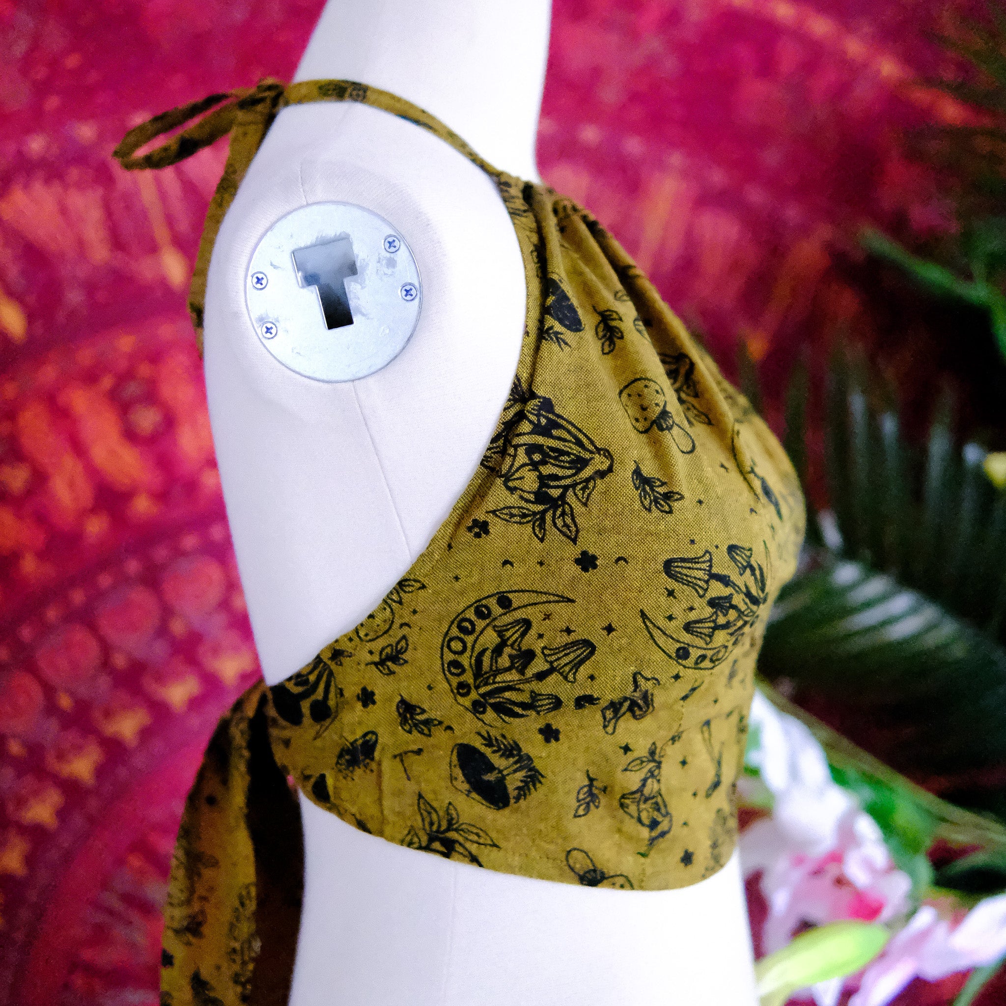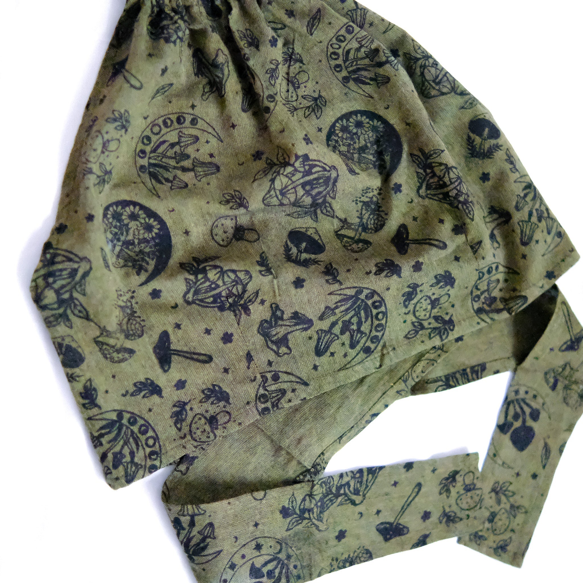 This Mushroom/Celestial Halter Top is a handmade cotton crop top perfect for summer. With a unique mushroom, sun and moon print, this top brings a boho, hippie and whimsical vibe to your wardrobe. Plus, it's backless and tie-up design makes it perfect for any body type. The earth tone and vibrant colors add a touch of 70s and 90s flair, making it great for beach days or festivals.
