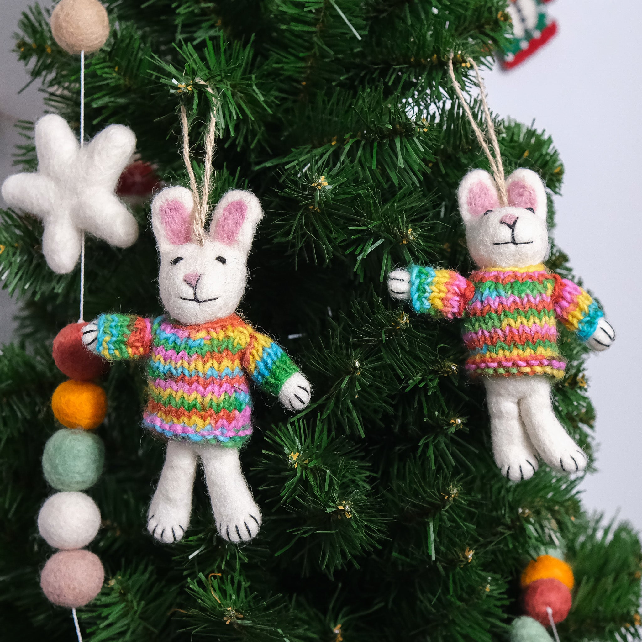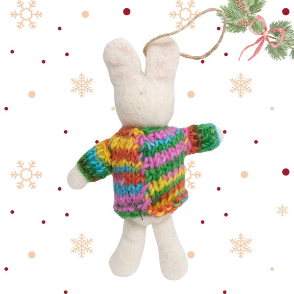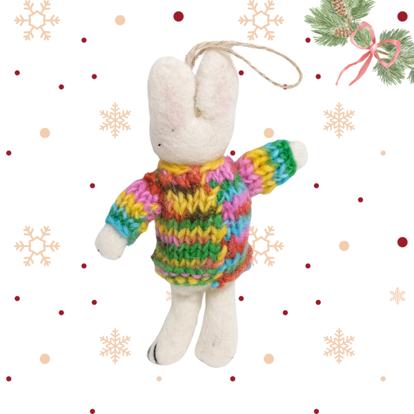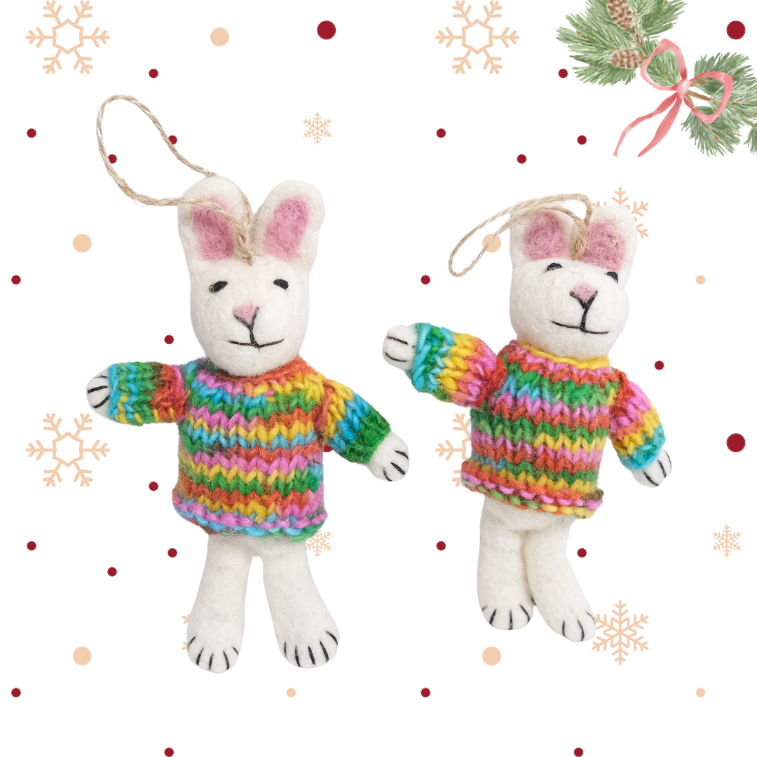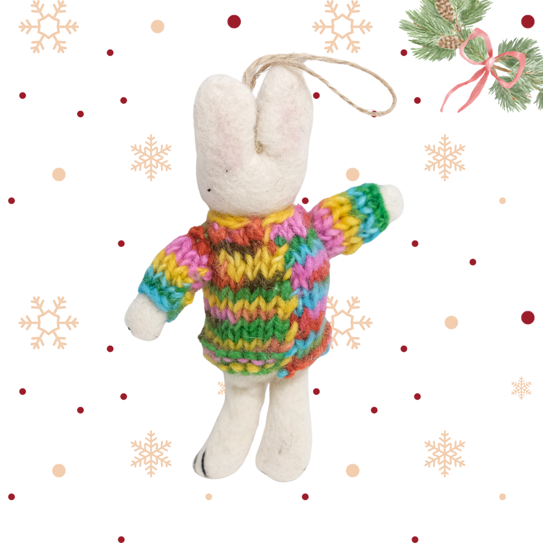 Bring a pop of color and cozy charm to your Christmas tree with these adorable needle felted bunny ornaments! Each bunny is lovingly handmade using soft wool and features a tiny, cheerful rainbow sweater—perfect for adding a whimsical, feel-good vibe to your holiday decor.