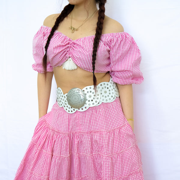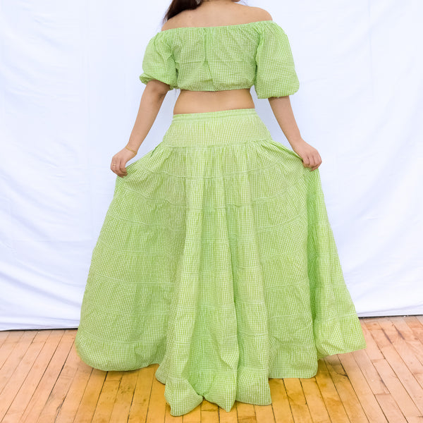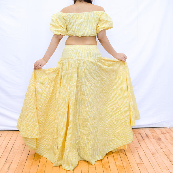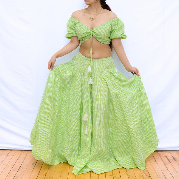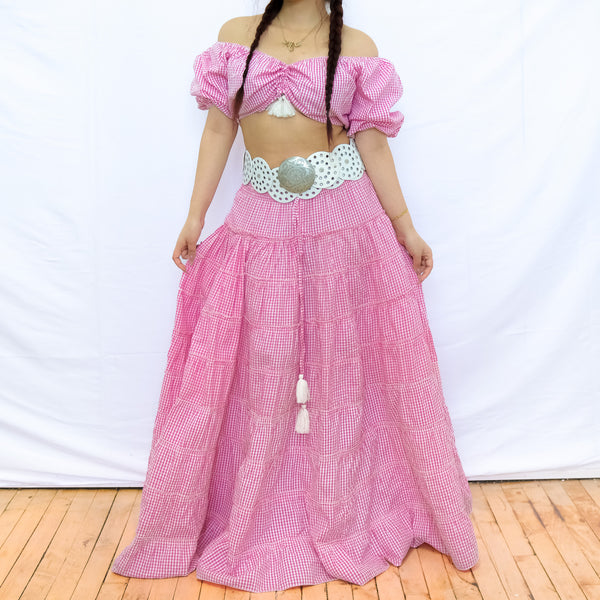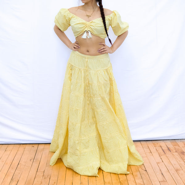 Step into your sunshine era with our handmade gingham two-piece set – a dreamy blend of vintage charm and modern boho spirit. This cottagecore-inspired outfit features a puff sleeve crop top with a flattering ruched front and playful tassel ties, paired with a full-tiered maxi skirt that sways with every step. Whether you're dancing barefoot at a festival, hosting a summer picnic, or simply twirling through your day, this set brings comfort, whimsy, and flair.