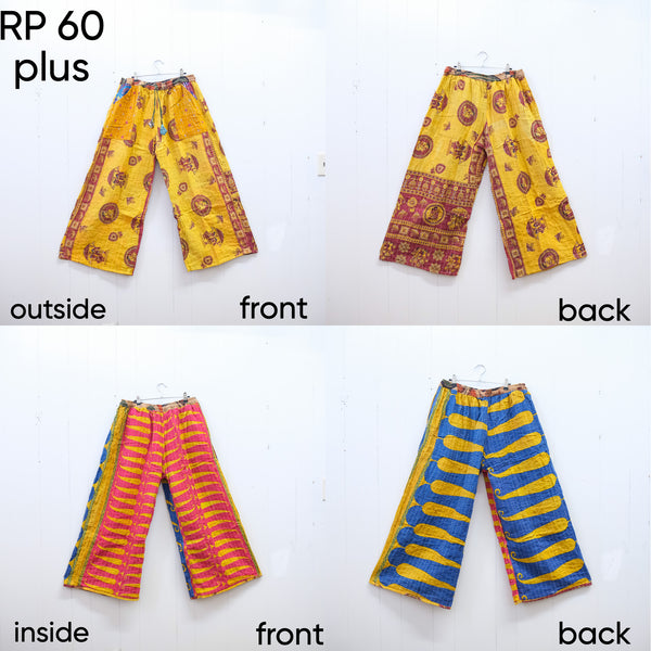 This Kantha reversible palazzo pants has an elastic waist with a drawstring to adjust and pockets in and out.