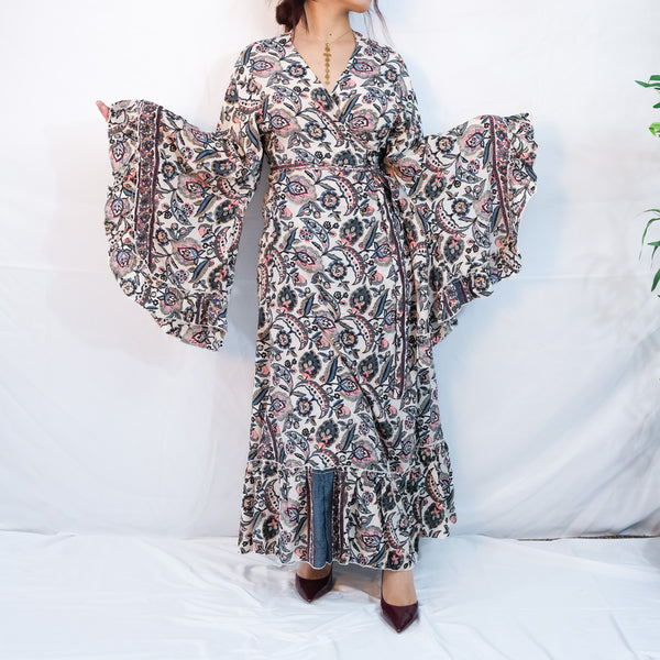 Step into a dreamy and ethereal fantasy with our Long Boho Wrap Dress. The flowy design features delicate ruffles that add a touch of bohemian elegance, perfect for summer or festival fashion. Embrace your inner fairy goddess with its ethereal vines and gypsy vibes.