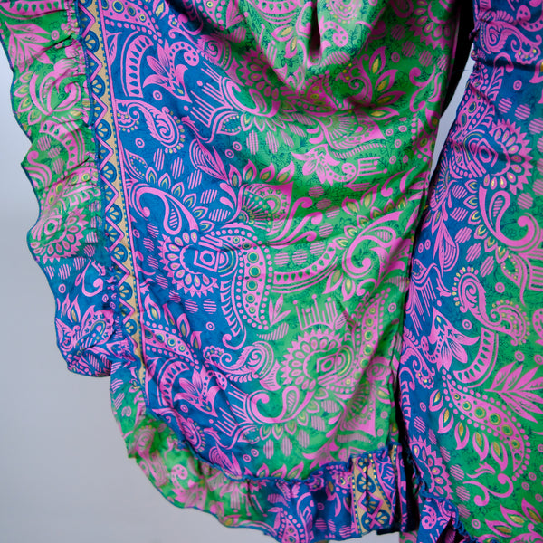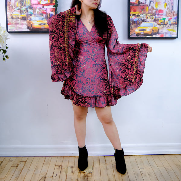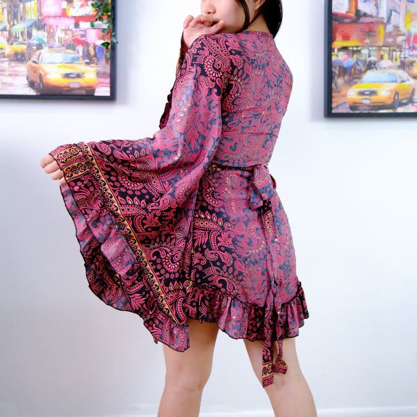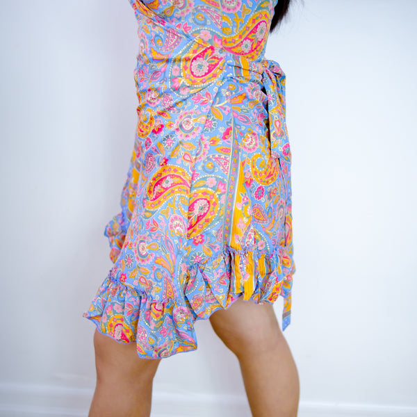 Introducing our handmade, paisley print Mini Wrap Frill Dress, perfect for capturing those whimsical, bohemian vibes. This adjustable dress features ruffle sleeves and a feminine frill, perfect for the summer sun. Embrace retro fashion and boho style with this must-have addition to your wardrobe.