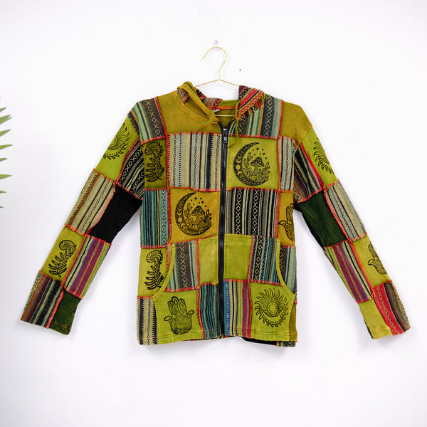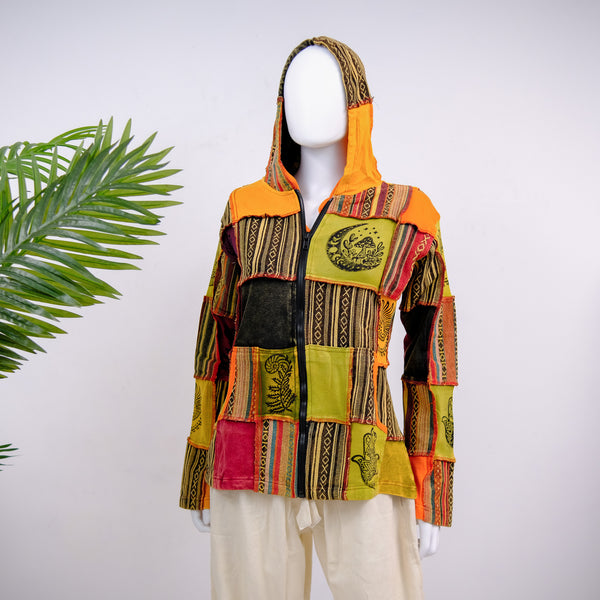 Defy fall and winter fashion with style with this Patchwork Block Print Unisex Jacket! Crafted out of handwoven fabrics, this unique jacket features a hoodie and block print designs. It's colorful boho and hippie style make it perfect for unisex fashion in the colder months. The zipped closure offers both warmth and protection, while the patchwork adds a playful touch.