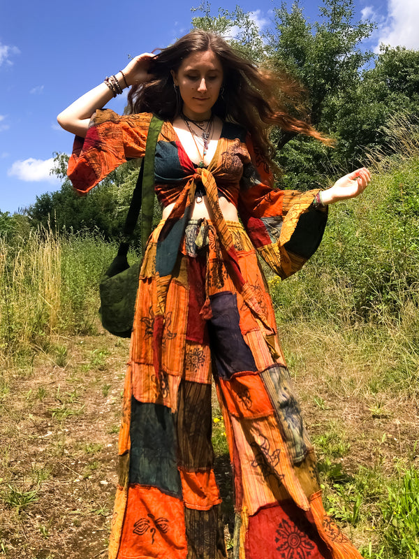 Express your sense of boho style with these handmade, patchwork palazzo wide-leg sets. Crafted from organic cotton for a breathable, festival-ready feel. These hippie-style trousers offer a comfortable style for any occasion.