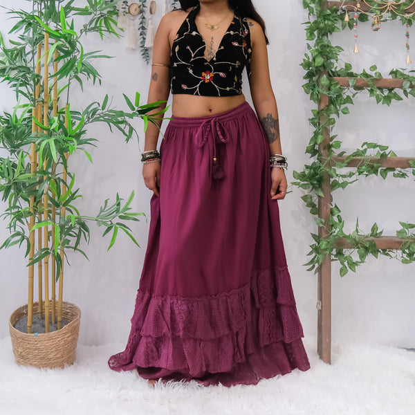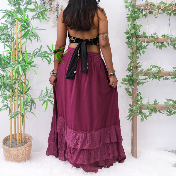 Step into effortless bohemian elegance with our handmade Boho Lace Tiered Maxi Skirt, crafted from soft, breathable cotton and beautifully finished with vintage-style crochet lace. This dreamy full-length skirt flows with every step, creating a romantic, fairycore silhouette perfect for festivals, travel, beach days, or everyday styling.
